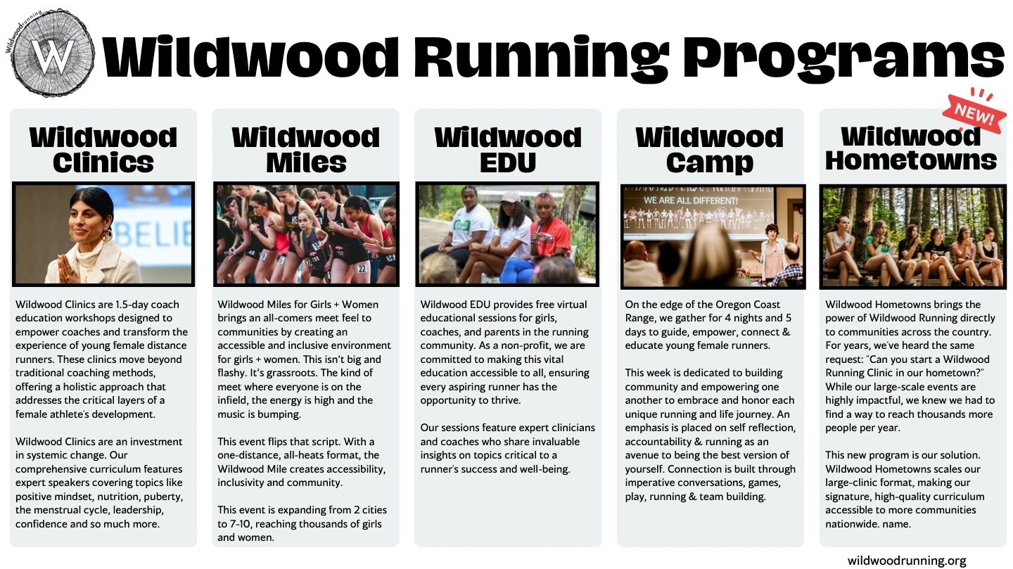 Wildwood is committed to guide, empower, connect & educate young female runners and coaches that impact young female runners.